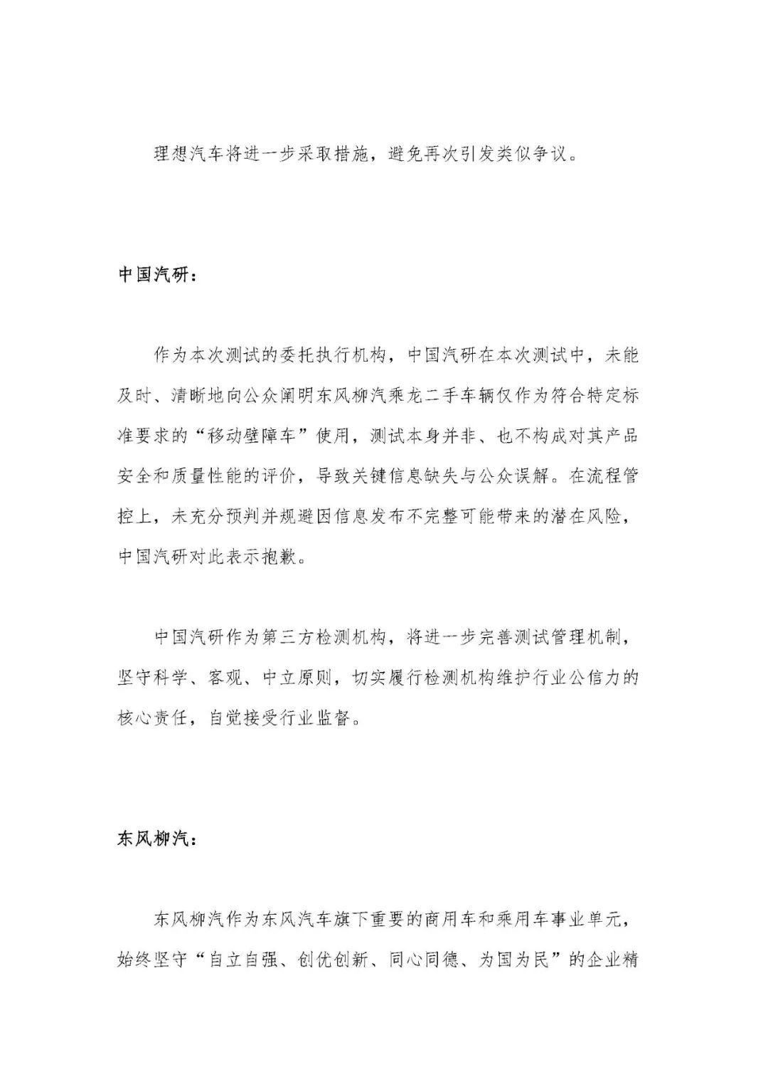 本次測試目的是驗證和提升理想i8的被動安全性能,並不針對任何其他品牌車輛的安全和質量性能。對於測試過程導致東風柳汽乘龍品牌被意外捲入輿情爭議,對相關內容的傳播可能引發的品牌關聯風險預估不足,導致東風柳汽乘龍品牌無端陷入負面輿情,對其品牌形象造成損害,帶來不良影響,同時也讓長期支持和使用東風柳汽產品的卡友及相關公眾造成了誤解,理想汽車在此表示誠摯的歉意。理想汽車無意冒犯,也從未刻意想通過此次測試質疑或影射東風柳汽的車輛產品質量與安全性。