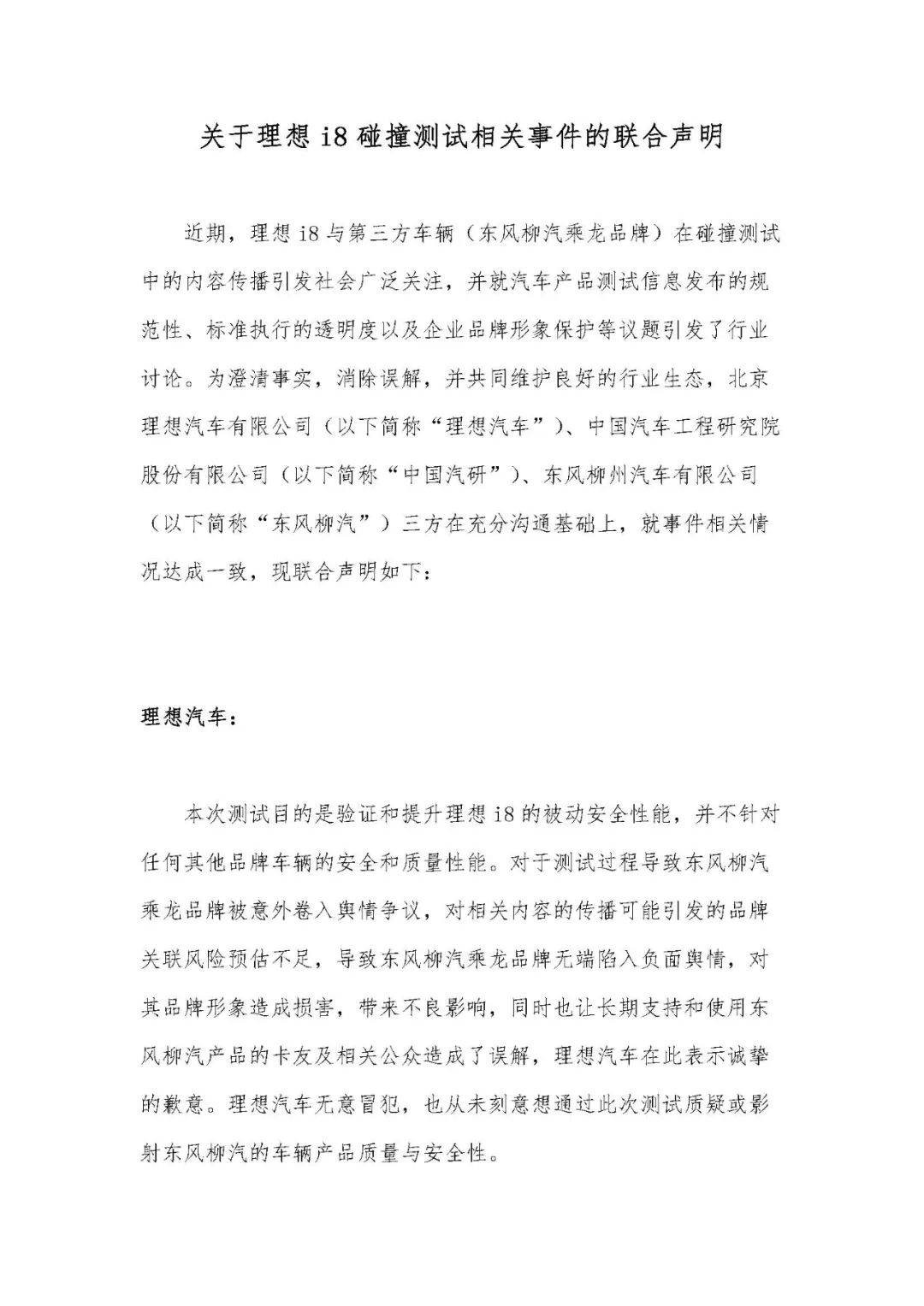 近期,理想i8與第三方車輛(東風柳汽乘龍品牌)在碰撞測試中的內容傳播引發社會廣泛關注,並就汽車產品測試信息發佈的規範性、標準執行的透明度以及企業品牌形象保護等議題引發了行業討論。為澄清事實,消除誤解,並共同維護良好的行業生態,北京理想汽車有限公司(以下簡稱“理想汽車”)、中國汽車工程研究院股份有限公司(以下簡稱“中國汽研”)、東風柳州汽車有限公司(以下簡稱“東風柳汽”)三方在充分溝通基礎上,就事件相關情況達成一致,現聯合聲明如下: