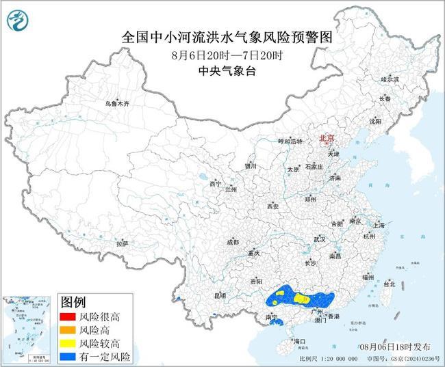 預計,8月6日20時至7日20時,廣東北部、廣西北部和東南部等地部分地區發生中小河流洪水的氣象風險較高(黃色預警),其中,廣東西北部、廣西東北部等地局地發生中小河流洪水的氣象風險高(橙色預警)。請各地密切注意降水引發的中小河流洪水,並做好即時監測、防汛預警和轉移避險等防範工作。