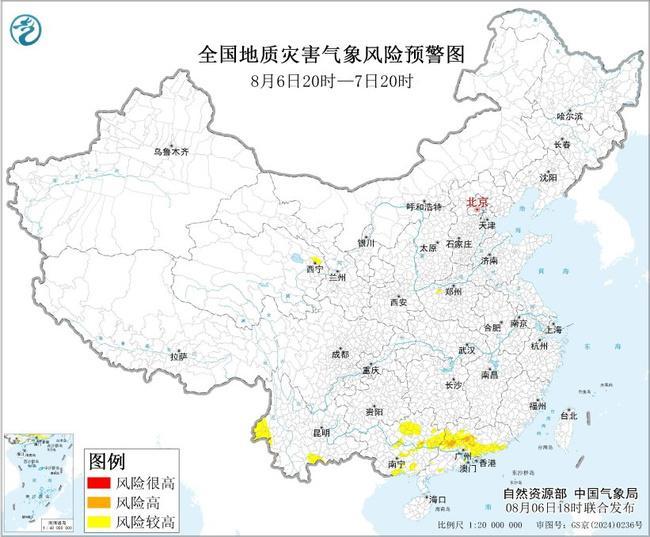 預計,8月6日20時至7日20時,河南西部、廣東中北部和東南部、廣西中東部、雲南西部和東南部、青海東北部等地部分地區發生地質災害的氣象風險較高(黃色預警),其中,廣東中北部、廣西東部等地部分地區發生地質災害的氣象風險高(橙色預警)。