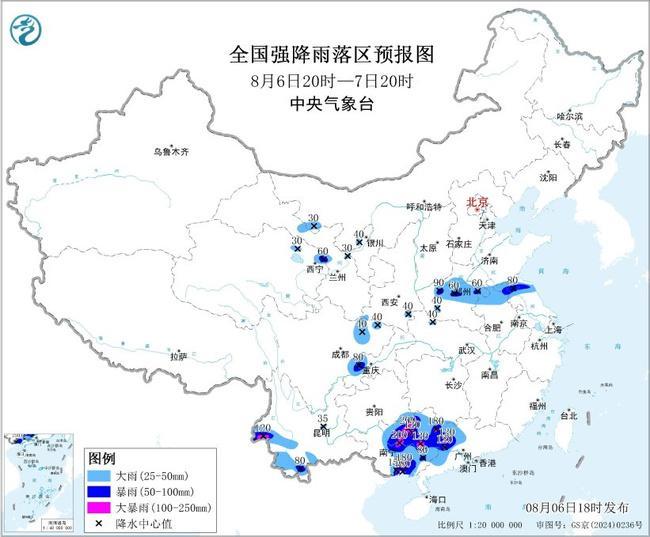 預計,8月6日20時至7日20時,廣西大部、廣東西部、雲南西部、四川盆地中部、河南西部和中北部、安徽北部、江蘇北部、青海東北部、甘肅中部等地部分地區有大到暴雨,其中,廣西北部和東部、廣東西部、雲南西部等地部分地區有大暴雨(100~200毫米)。上述部分地區伴有短時強降水(最大小時降雨量20~50毫米,局地可超過80毫米),局地有雷暴大風等強對流天氣。