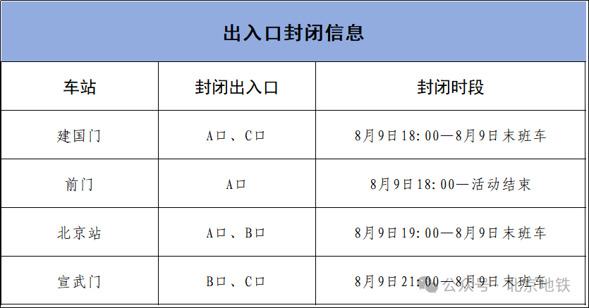 根據北京市公安局公安交通管理局《關於對部分道路採取臨時交通管理措施的通告》,為保障專項活動安全順利,2025年8月9日18時至活動結束,地鐵1號線八通線、2號線、5號線、8號線部分車站採取出入口封閉、車站封閉措施,相關換乘站停止換乘,請您合理安排出行。