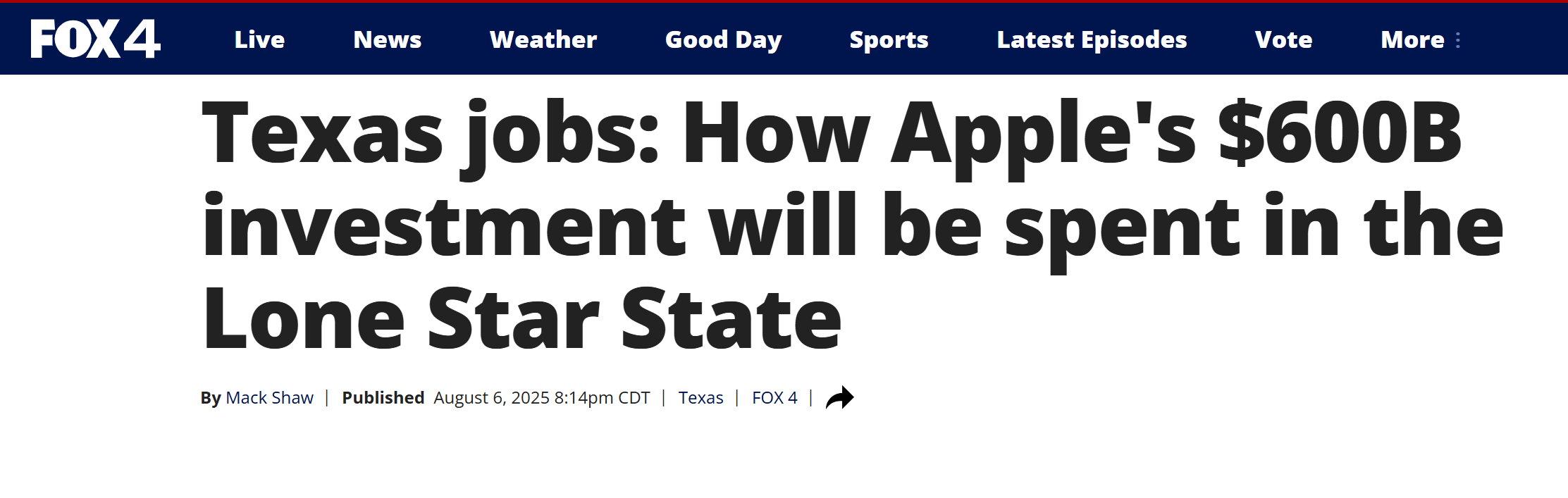 據福克斯報道,蘋果公司近日宣佈將在美國製造業的投資增加至6000億美元。這一數字是在其今年早些時候承諾四年內投入5000億美元的基礎上,額外追加1000億美元形成的。