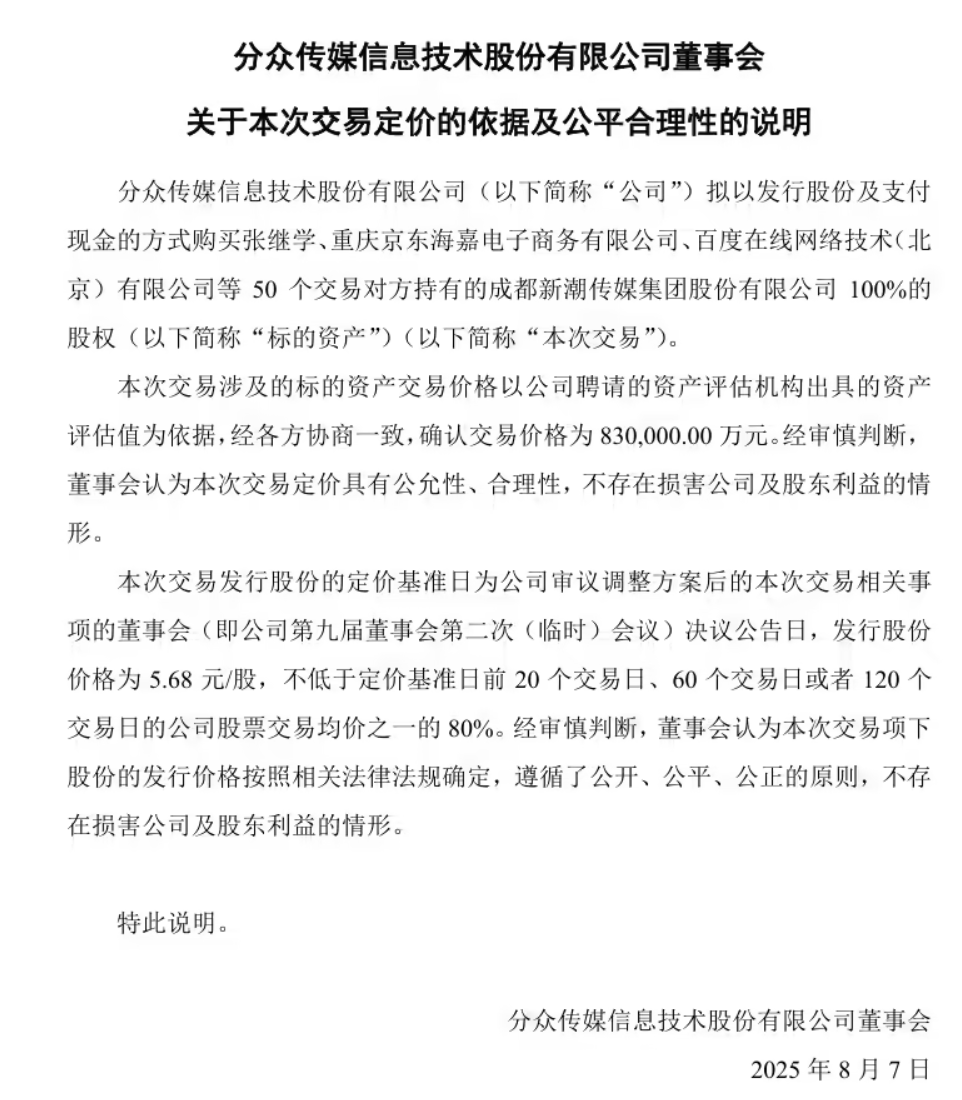 【環球網科技綜合報道】8月6日晚間,分眾傳媒發佈公告稱,公司擬以發行股份及支付現金的方式,收購張繼學、重慶京東、百度在線等50個交易對方持有的新潮傳媒100%股權,交易價格為83億元。交易完成後,新潮傳媒將成為分眾傳媒的全資子公司。