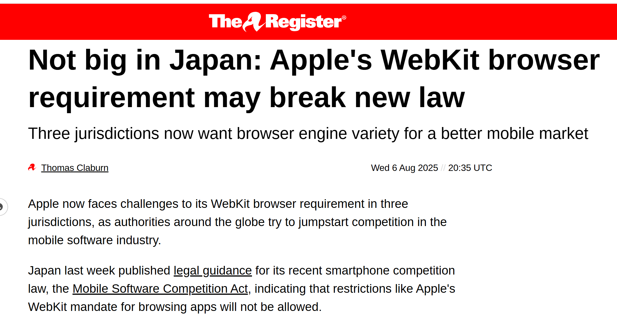 【環球網科技綜合報道】8月7日消息,日本政府近日正式要求蘋果公司在其iOS系統上開放第三方瀏覽器引擎,並明確規定最遲須在2025年12月前完成相關調整。這一舉措依據《移動軟件競爭法》新發布的指南實施,該法律是在近期通過的《智能手機法》基礎上擴展而成,直指蘋果公司長期以來在App Store中實施的限制性政策。