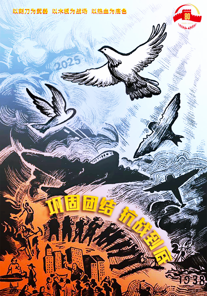尋訪結束時,00後大學生劉一竹在自己設計的海報上方畫上了翱翔的和平鴿。她感慨地説:“80多年過去,版畫上的刀鋒仍時刻提醒我們:銘記歷史啓示,勇擔時代重任,讓青春之光照亮和平的未來。”