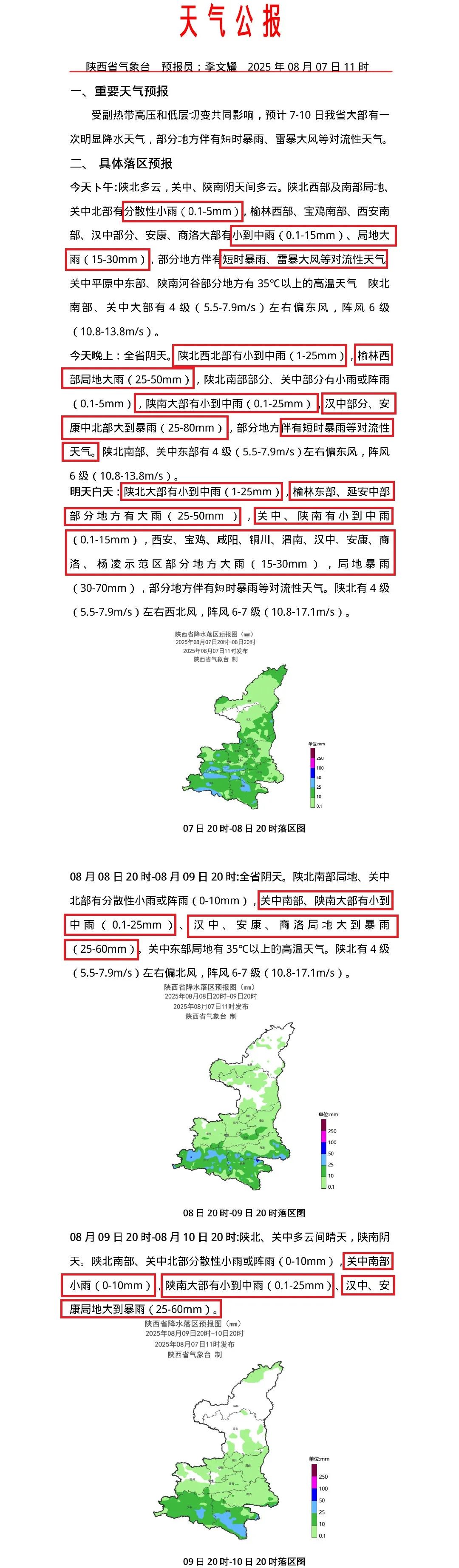 受副熱帶高壓和低層切變共同影響,預計8月7日11時至8月8日11時,西安西部及南部山區、寶雞西南部山區、咸陽南部、延安西部、榆林西部、漢中部分、安康部分、商洛部分地方、楊淩示範區有大雨(25~50毫米);西安南部局地(長安區、鄠邑區、藍田縣、周至縣),寶雞南部局地(太白縣、鳳縣),咸陽南部局地(秦都區、興平市)、延安西部(吳起縣)、榆林西部(榆陽區、橫山區、神木市、府谷縣、定邊縣、靖邊縣),漢中局地(南鄭區、城固縣、洋縣、勉縣、略陽縣、鎮巴縣、寧強縣、留壩縣、佛坪縣),安康局地(漢濱區、寧陝縣、嵐皋縣、平利縣、鎮坪縣、旬陽市),商洛局地(商州區、洛南縣、山陽縣、鎮安縣、丹鳳縣、商南縣)有暴雨(50~100毫米),其中漢中略陽縣、寧強縣有大暴雨(100~180毫米)。上述部分地區伴有短時強降水(最大小時降雨量30~50毫米,局地可達80毫米以上),局地有雷暴大風或冰雹等強對流天氣。