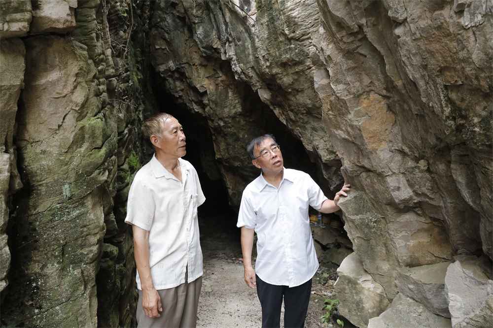 8月3日,在遵化魯家峪村附近一烈士洞,李自亞(右)向魯家峪陳列館志願者劉超(左)講述當年母親救助八路軍情況。記者 師源攝