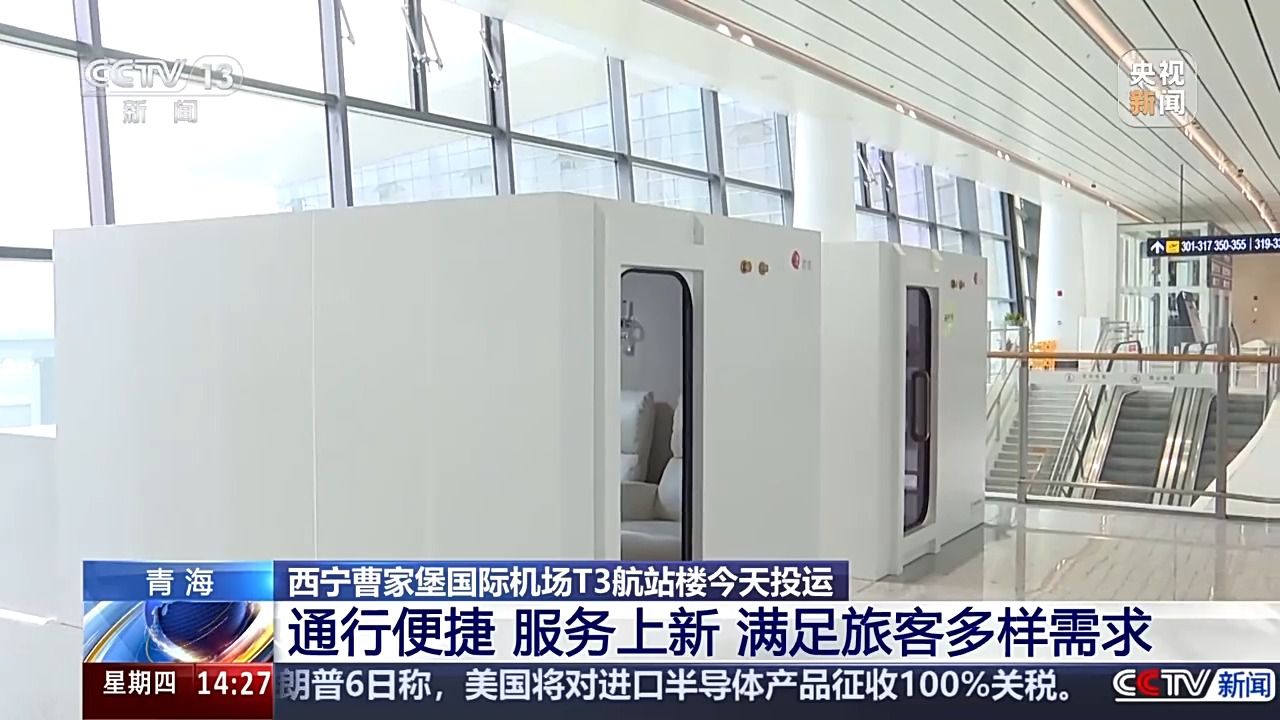 *總枱記者 崔建軍:*候機大廳內,商業區、親子休閒區、母嬰室、閲讀室等各類服務設施一應俱全,休息座椅間配備了充電插口和電源插座,旅客們坐在座椅上就可以隨手充電。特別要提到的是,因為西寧地處青藏高原,市區平均海拔在2260米左右,一些外地旅客來到高原,不適應這裏的氣候環境。為此,一方面,機場在候機大廳和到達層都配備了全新密閉的有氧艙,旅客在艙內可以自主調節氣壓並供應氧氣,更好地舒緩放鬆;另一方面,還新投入了多間獨立式、智能感應的更衣室,方便旅客根據氣温變化更換衣物。