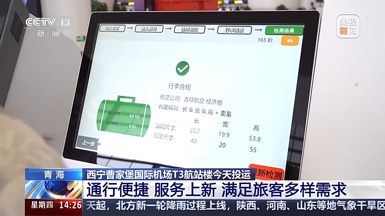 *總枱記者 崔建軍:*為了方便旅客出行,新啓用的T3航站樓在通行管理設備上也進行了完善升級。不僅自助值機和自助托運行李的智能設備更多了,還新引入了智能行李測量系統。旅客只需將行李放置在機器上,通過掃描登機牌或手動選擇航空公司。短短幾秒時間,機器就能自動測量行李的重量和尺寸,快速判斷旅客隨身攜帶的行李是否符合航空公司的相關規定,有效減少因旅客自身誤判而導致的行程延誤。