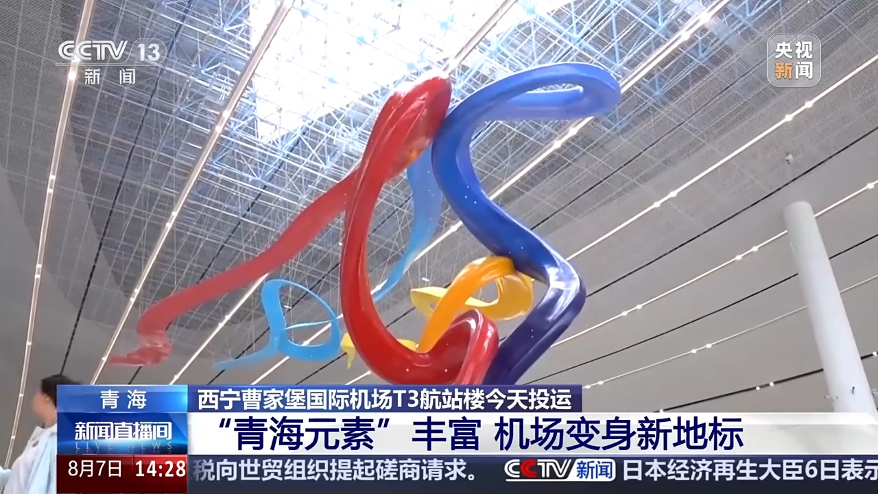 *總枱記者 崔建軍:*除了服務能力更加“硬核”,在T3航站樓內,我們還觀察到一個明顯的變化就是“顏值”更高了,這裏有隨處可見的“青海元素”。青海是我國長江、黃河和瀾滄江的發源地,被譽為“中華水塔”。在我身後,這個由3條靈動的飄帶構成的航站樓主景觀“中華水塔”,就象徵着這3條河流,寓意青海“三江之源”的生態地位。此外,還設有藏羚羊、黑頸鶴、野犛牛等高原野生動物景觀雕塑,青海生物多樣性微展館以及《唐蕃古道》《河湟皮影》等各類藝術作品。旅客們不僅能參觀,還能動手模擬體驗藏毯編織、演皮影戲,沉浸式感受青海的風光。