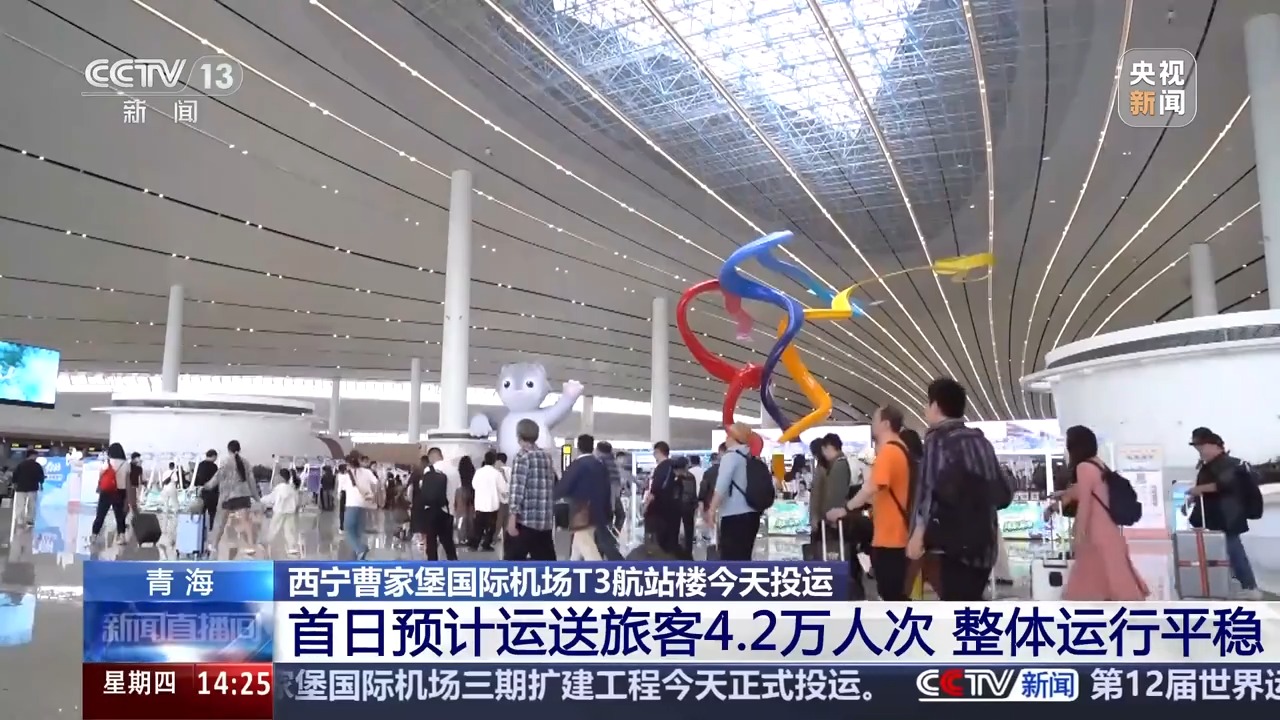 *總枱記者 崔建軍:*我現在就在西寧曹家堡國際機場T3航站樓的出發大廳。機場方面預測,T3航站樓啓用第一天,將執行起降航班308架次,運送旅客數量約4.2萬人次。自今天0時正式投運以來,目前整體的運行情況平穩。