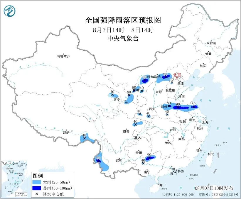 中央氣象台今天10時 繼續 *發佈暴雨藍色預警:預計,*8月7日14時至8日14時,內蒙古河套地區、山西北部、河北西部、寧夏北部、甘肅中南部、青海東部、山東南部、江蘇北部、安徽北部、河南中北部、陝西南部、四川東部、廣西北部、雲南西部、西藏東南部等地部分地區有大雨,其中,內蒙古西南部、寧夏北部、山西東北部、河北西部、河南中部和東部、安徽北部、江蘇北部、雲南西南部、廣西北部等地部分地區有暴雨,局地有大暴雨。上述部分地區伴有短時強降水,局地有雷暴大風等強對流天氣。