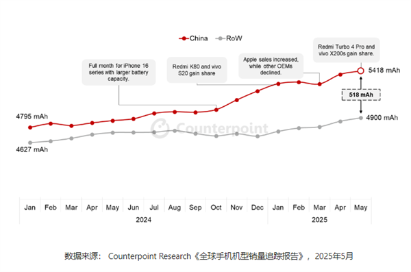 【環球網科技綜合報道】據數據機構Counterpoint Research最新發布的《全球手機機型銷量追蹤報告》顯示,2025年5月中國市場智能手機平均電池容量達5418mAh,同比顯著增長11%,遠超同期全球其他地區3%的增長幅度,持續保持全球領先地位。