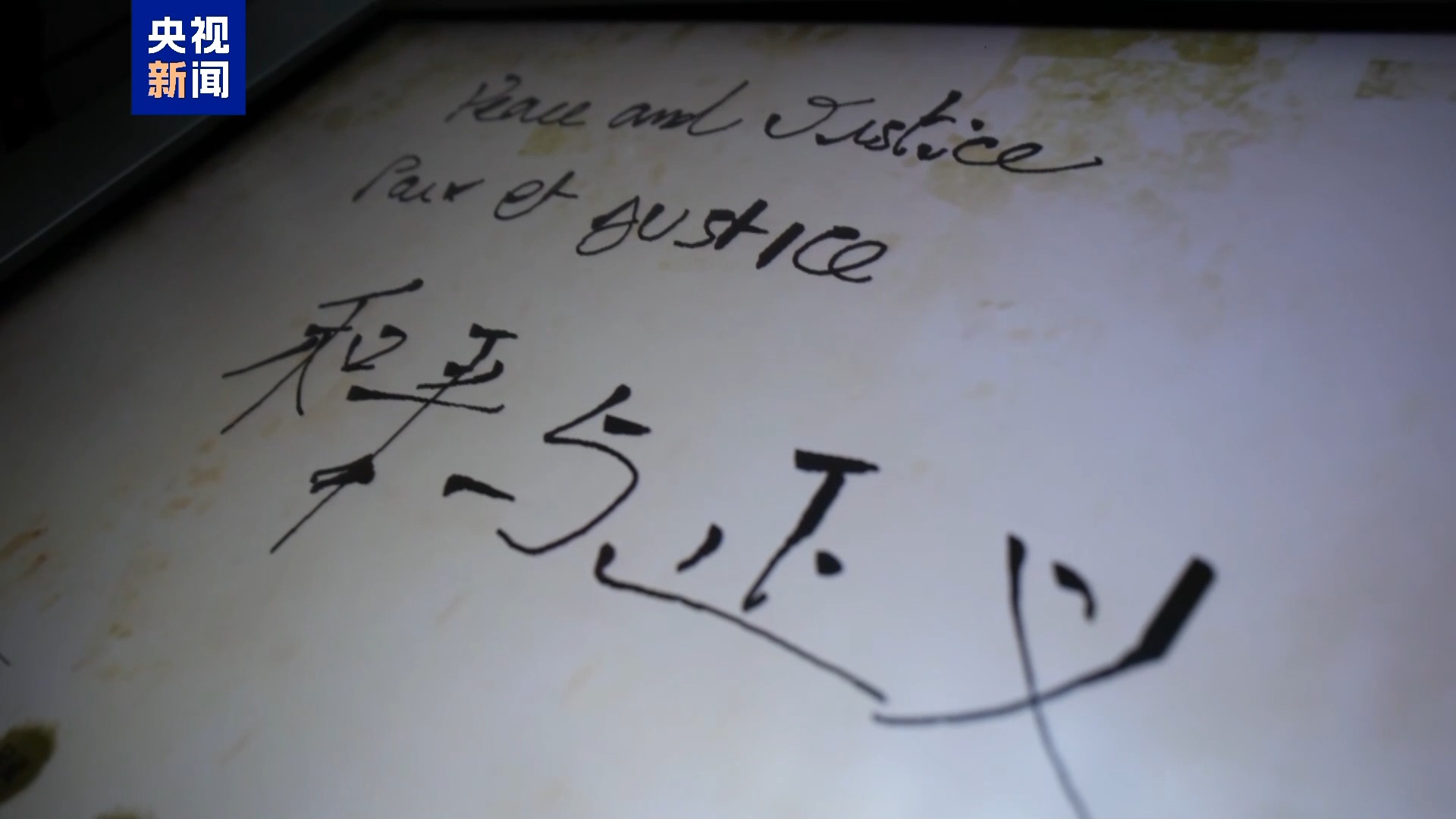 參觀完畢後,馬庫斯和士傑、鍾灝松一起用中文、英文、法文在留言板上寫下了“和平與正義”。