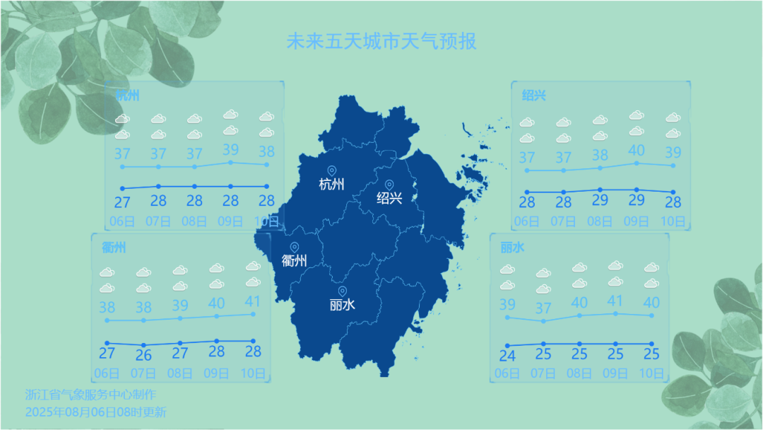 浙江省氣象台繼續發佈高温報告:受副熱帶高壓影響,近期我省氣温較高,預計今明天全省大部地區日最高氣温可達35-38℃,個別39℃以上 。