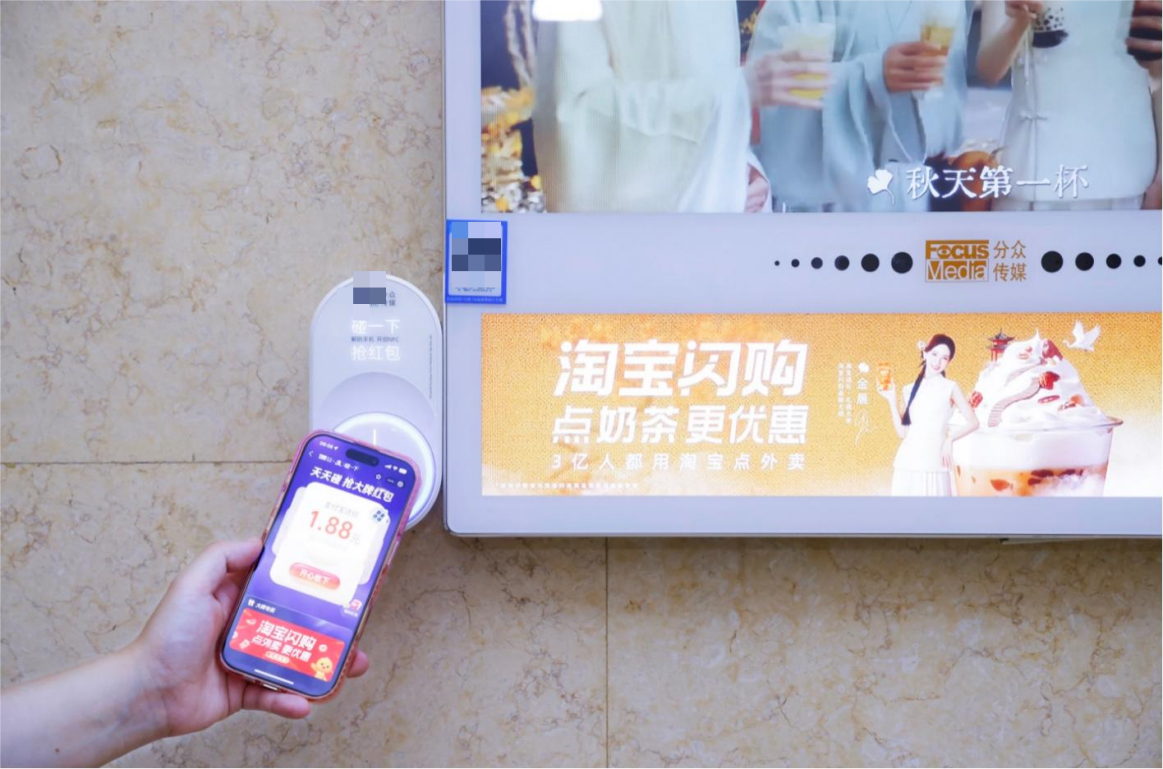 目前,分眾電梯屏旁加裝支付寶定製NFC藍環,針對電梯場景優化芯片,感應成功率 >99%。用户解鎖手機後輕觸藍環,即可領取紅包/優惠券,無需掃碼或跳轉頁面,效率能夠得到有效提升。