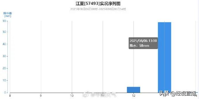 8月6日,武漢市江夏區迎來強降雨天氣。據中國天氣消息,江夏區7月起至昨天累積降水量僅10毫米出頭,6日中午的強降雨在12時至13時的一小時內,雨量就高達58毫米,不僅成為同時次全國雨量第一,更達到了當地7月以來累積雨量的5倍。