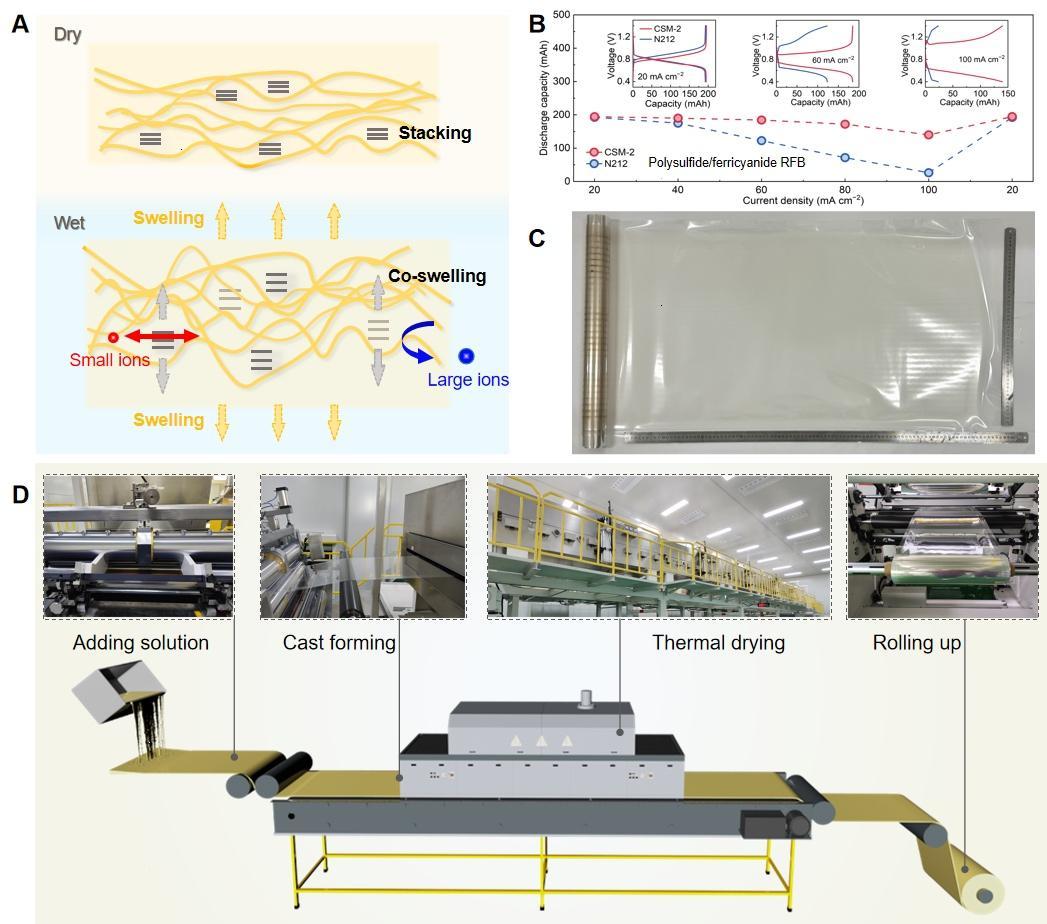 另悉,經過數年攻關,團隊還成功將這一實驗室創新成果轉化為了工業化產品。團隊創新設計了“懸浮液-熱定型”工藝,解決膨脹土或膨潤土等水環境膨脹顆粒在成膜過程中的團聚難題,並開發出了膨脹離子交換膜的卷對卷流延連續制膜產線。目前,該產線已完成小試和中試驗證,產線單卷膜材製備面積達數十平方米,產學研合作企業計劃規劃鋪開年產30萬平米的產線。