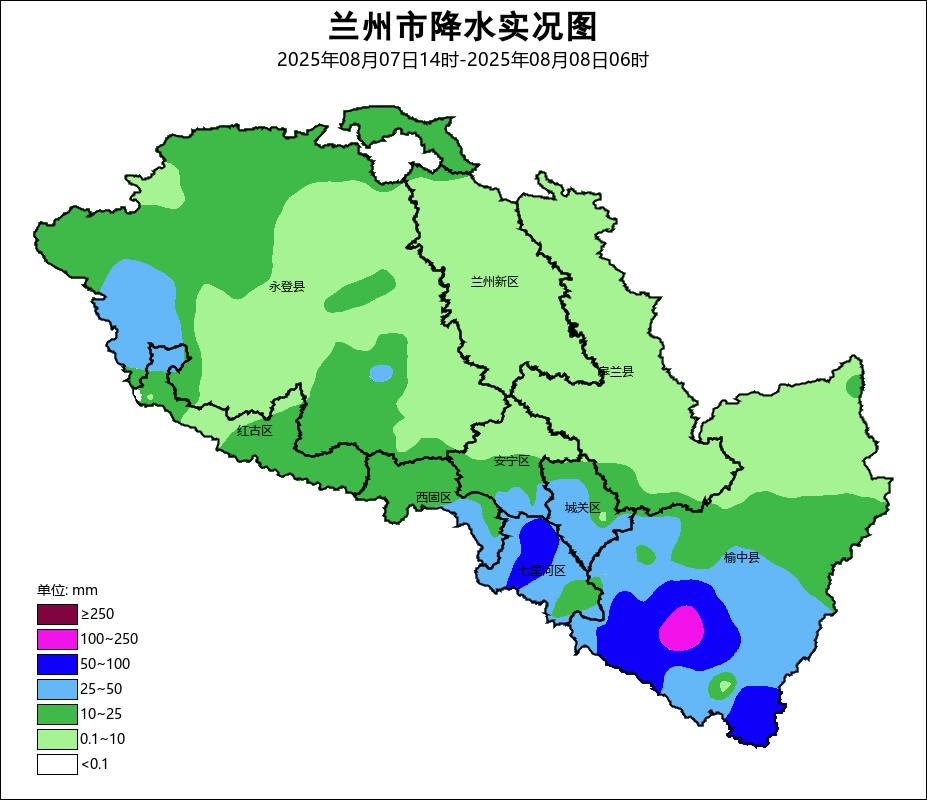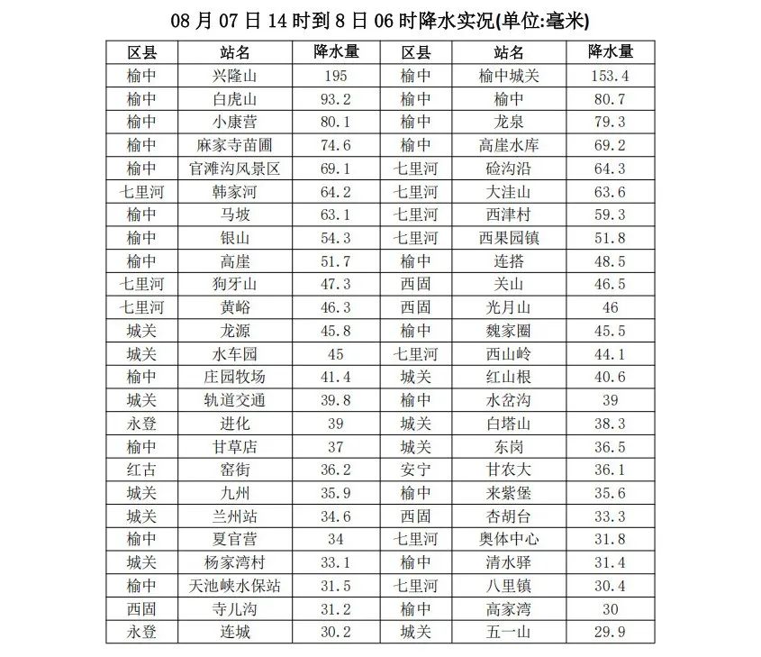 降水:7日傍晚開始,蘭州榆中南部、七里河大部出現暴雨及大暴雨天氣,城關、西固、紅古西部、永登西部出現大雨,其餘地區小到中雨,截至8日6 時,最大降水量(單位:毫米)出現在榆中興隆山 195.0(預估)。其餘各縣區最大降水量(單位:毫米)分別為:七里河礆溝沿64.3、西固關山46.5、永登東河沿39.0、紅古窯街36.2、安寧甘農大 36.1、皋蘭打磨溝 11.0、蘭州新區平峴村10.2。另外,榆中三角城 80.7、蘭州五里鋪 34.6、永登城關 6.5、蘭州新區中川6.5、皋蘭三川口 0.5。