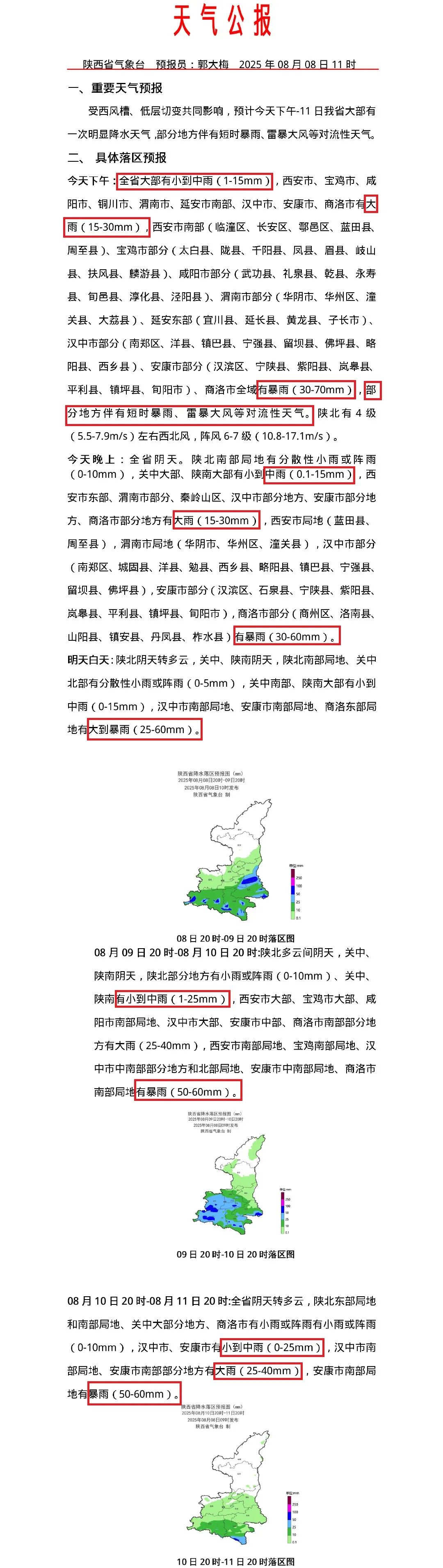 受副熱帶高壓和低層切變共同影響,預計8月8日09時至8月9日09時,西安部分、寶雞東部及南部山區、咸陽部分、銅川部分、渭南部分、延安南部、榆林北部、漢中部分、安康部分、商洛有大雨(25~50毫米);西安部分(閻良區、臨潼區、長安區、鄠邑區、藍田縣、周至縣),寶雞南部局地(眉縣、太白縣、鳳縣),銅川局地(王益區、印台區),渭南部分(臨渭區、韓城市、華陰市、華州區、潼關縣、大荔縣、合陽縣、富平縣),延安南部局地(宜川縣)、榆林北部(神木市、府谷縣),漢中部分(南鄭區、城固縣、洋縣、勉縣、西鄉縣、略陽縣、鎮巴縣、寧強縣、留壩縣、佛坪縣),安康部分(漢濱區、石泉縣、寧陝縣、紫陽縣、嵐皋縣、平利縣、鎮坪縣、旬陽市),商洛部分(商州區、洛南縣、山陽縣、鎮安縣、丹鳳縣、柞水縣)有暴雨(50~100毫米),其中渭南局地(華陰市、華州區)、漢中局地(略陽縣)、安康局地(旬陽市)、商洛局地(洛南縣、鎮安縣)有大暴雨(100~180毫米)。上述部分地區伴有短時強降水(最大小時降雨量30~50毫米,局地可達80毫米以上),局地有雷暴大風或冰雹等強對流天氣。此次過程主雨帶位於陝北東北部及南部局地、關中和陝南部分地方,以分散性對流性降水為主,降水主要在8日白天至夜間。過程短時雨強大,暴雨多點散發,加之夏季強降水對流性強且複雜多變,上述相鄰縣區也需高度關注。