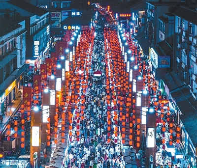 暑期,河南洛陽市十字街夜市熙熙攘攘。青石板路、傳統門楣古風古韻,一串串大紅燈籠高高掛起,小吃攤的吆喝聲此起彼伏。