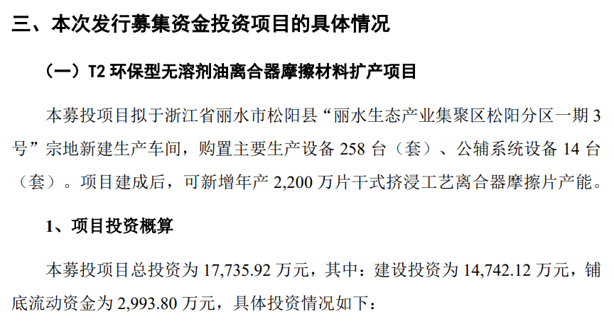 在本次申報北交所IPO時,公司提出的募投項目為“乾式擠浸環保型離合器摩擦材料技改項目”,總投資為15116.80萬元,具體包括購置主要生產設備142台(套)、公用輔助系統設備9台(套)。項目建成後,可新增年產1000萬片乾式擠浸工藝離合器摩擦片產能。