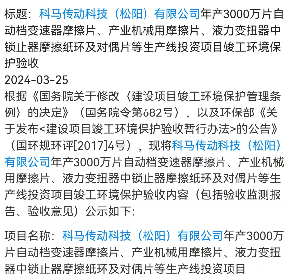 此外,科馬傳動是科馬材料的控股子公司,公開信息顯示,科馬傳動投建的“科馬傳動科技(松陽)有限公司年產3000萬片自動檔變速器摩擦片、產業機械用摩擦片、液力變扭器中鎖止器摩擦紙環及對偶片等生產線投資項目”,已於2024年3月通過了竣工環保驗收。但從科馬材料招股書披露的信息來看,2024年公司產能僅比上年度增加了300萬片左右,與前述已通過竣工驗收項目對應的3000萬片產能相差巨大。