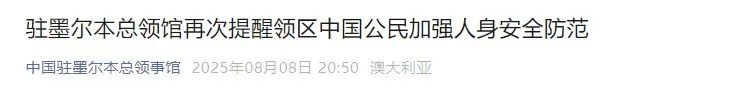 8月8日,中國駐墨爾本總領館再次提醒領區中國公民加強人身安全防範。