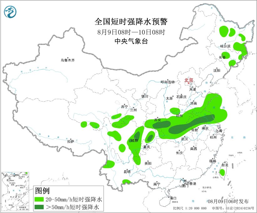 預計8月9日08時至10日08時,東北地區中部、黃淮中部、江漢中北部、江淮東部、西南地區東部等地的部分地區將有8級以上雷暴大風或冰雹天氣,其中,山東東部和南部、江蘇中北部、湖北北部、四川東南部等地的部分地區將有10級以上雷暴大風,最大風力可達11級以上;東北地區中東部、西北地區南部、黃淮中南部、江漢大部、江淮中北部、西南地區東部等地的部分地區將有小時雨量大於20毫米的短時強降水天氣,其中,陝西南部、河南南部、安徽中北部、江蘇中北部、湖北北部、四川中東部等地的部分地區小時雨量大於50毫米,最大可達80毫米以上。