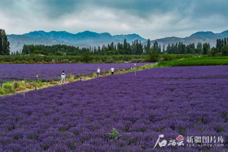 6月20日,遊客在霍城縣蘆草溝鎮四宮村薰衣草花田裏參觀遊覽。(資料圖)