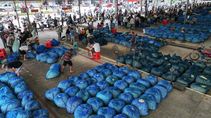在當地石井茉莉花交易市場,茶商在收購茉莉花(7月31日攝)。