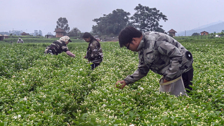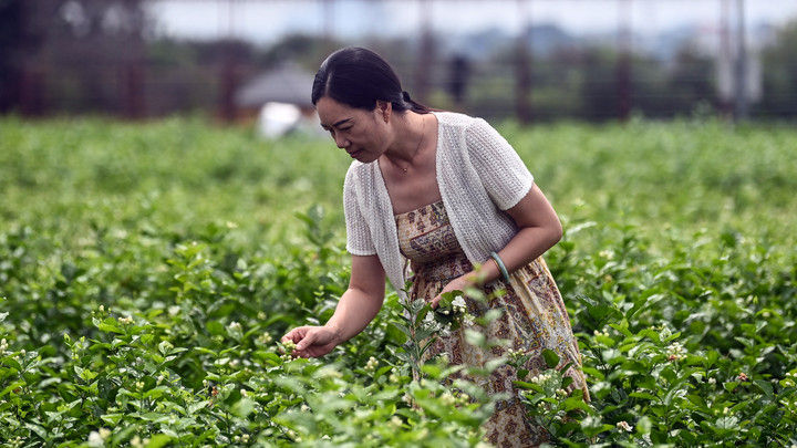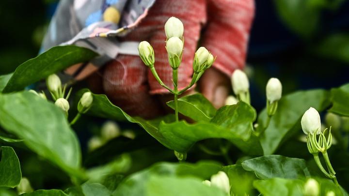 地處桂南的廣西橫州市,憑藉富硒沃土與獨特氣候,擁有超過18萬畝的茉莉花田,茉莉花(茶)產量佔中國總產量80%以上,佔世界60%以上,有“中國茉莉之鄉”美譽。每年夏季是橫州茉莉花采摘季,花田連片,芬芳漫溢,花農在花海中穿梭,一派繁忙景象。