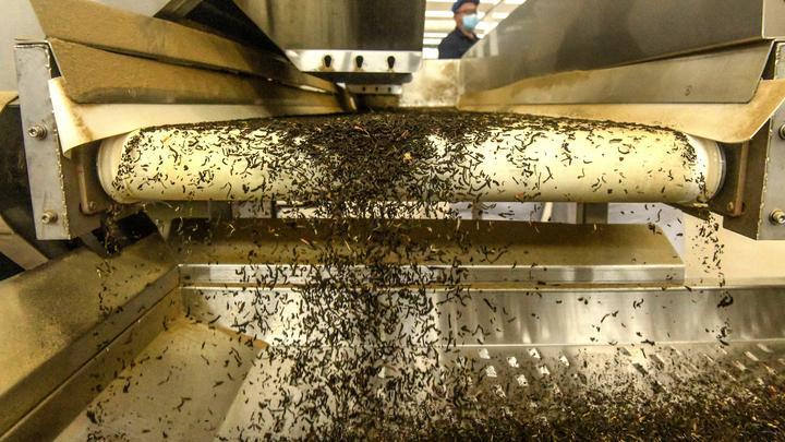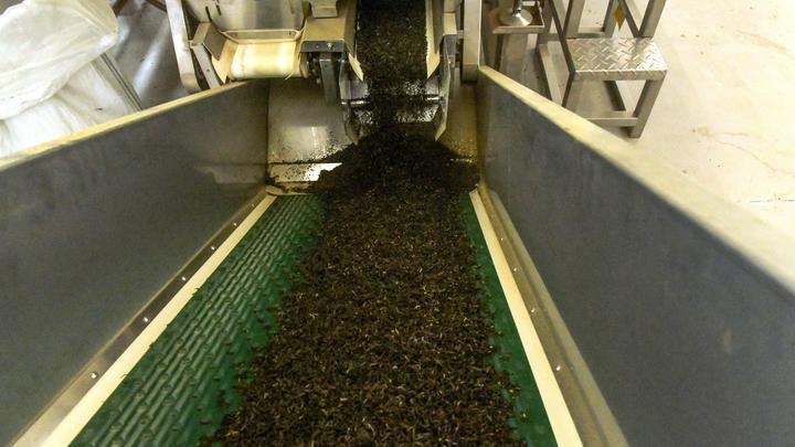 在廣西中肯茶業有限公司拍攝的生產線上的茉莉花茶(7月31日攝)。