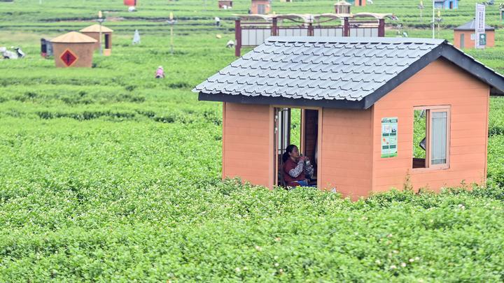 在橫州市中華茉莉園,雷水平勞作後在小舍中休息調整(7月31日攝)。