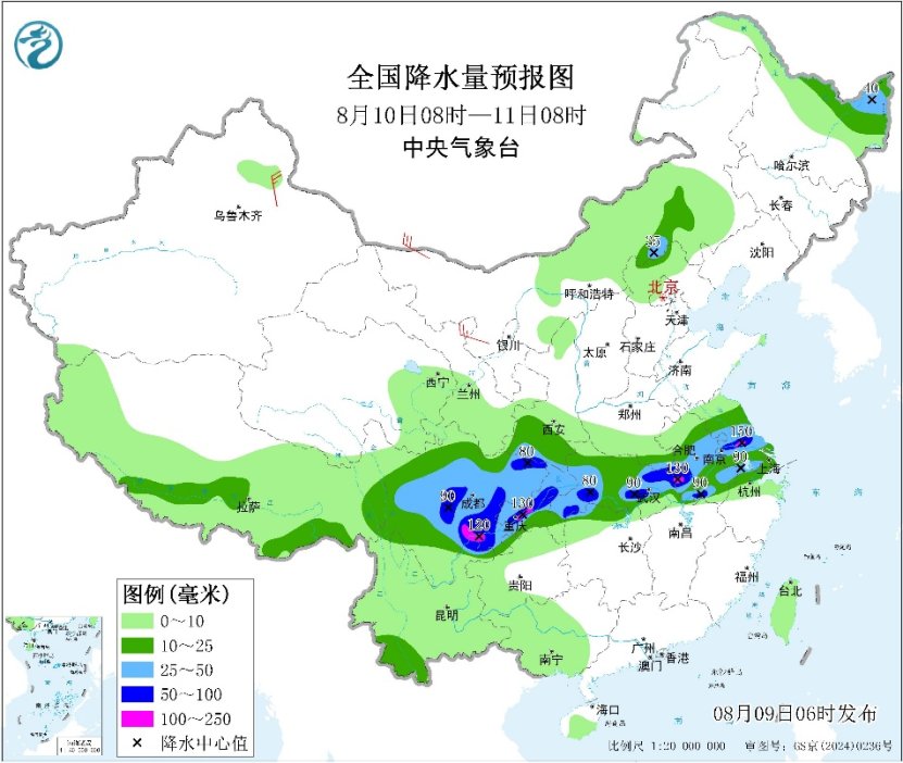 今天起,降雨區南壓,預計9日至13日,雨帶基本維持在川渝至蘇皖一帶,四川、重慶、湖北、湖南北部、安徽、江蘇、河南南部等地部分地區將有暴雨或大暴雨,公眾需多加警惕次生災害。