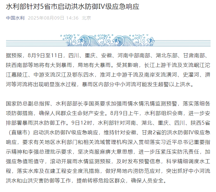 國家防總副總指揮、水利部部長李國英要求加強雨情水情汛情監測預警,落實落細各項防禦措施,確保人民羣眾生命財產安全。8月9日上午,水利部組織會商,進一步安排部署暴雨洪水防禦工作。9日12時,水利部針對河南、湖北、重慶、四川、陝西5省(直轄市)啓動洪水防禦Ⅳ級應急響應,維持針對安徽、甘肅2省的洪水防禦Ⅳ級應急響應,要求有關地區水利部門和相關流域管理機構深入貫徹落實習近平總書記重要指示精神和李強總理批示要求,堅決克服麻痹大意思想,進一步壓緊壓實防汛責任,加強應急值班值守,滾動開展雨水情監測預報,及時發佈預警信息,科學精細調度水工程,落實水庫及在建工程安全度汛措施,做好局地內澇防範應對,突出抓好中小河流洪水和山洪災害防禦等工作,提前轉移危險區羣眾,確保人員安全。