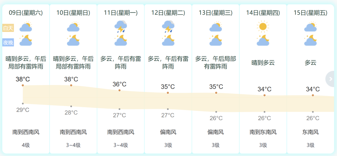 受副熱帶高壓影響,預計今天到明天我市均以晴到多雲天氣為主,副高控場氣温自然居高不下,今明兩天我市大部分地區最高氣温將達到37~39℃,局部39℃以上,請大家務必做好防暑防曬準備工作。由於午後低層温度高,容易觸發局地性熱對流,這種小對流雲團神出鬼沒,但強度不小,因此週末大家午後如有出行計劃還是要備好晴雨傘,遮陽擋雨兩不誤。