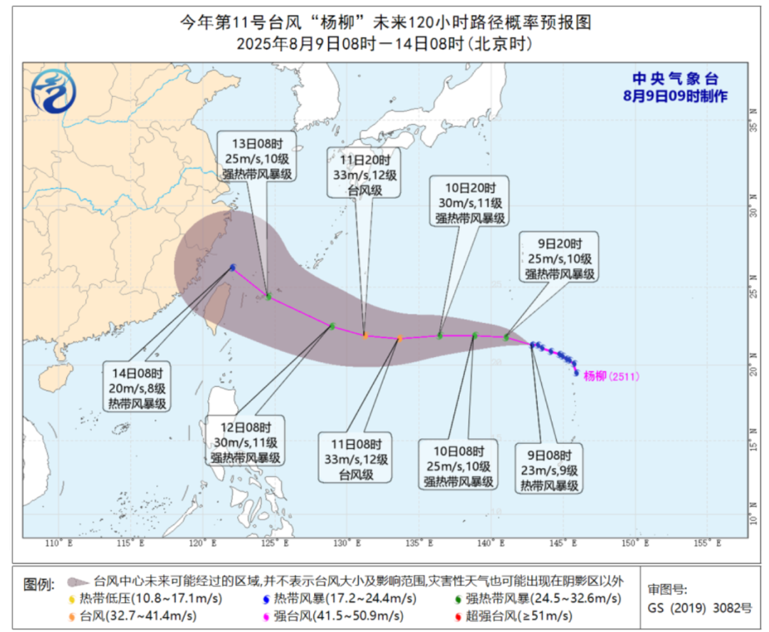 8月9日8時,今年第11號颱風“楊柳”的中心位於北緯21.3度,東經142.8度(距離美國關島北偏西方向約900公里),中心附近最大風速23米/秒(9級風,熱帶風暴級),中心最低氣壓992百帕。