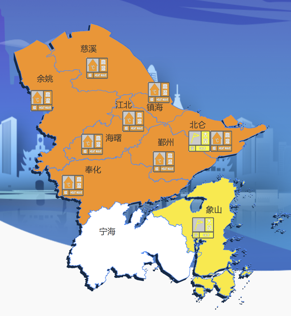 一早,市氣象台已發佈高温報告:受副熱帶高壓影響,今天到明天我市大部分地區最高氣温可達37~39℃,局部39℃以上,請注意做好防暑降温工作。另,今天我市沿海海面有8~9級偏南大風,請注意防範。截**至目前,海曙、江北、鎮海、北侖、鄞州、奉化、餘姚、慈谿等地已發佈高温橙色預警信號;北侖、象山發佈大風黃色預警。