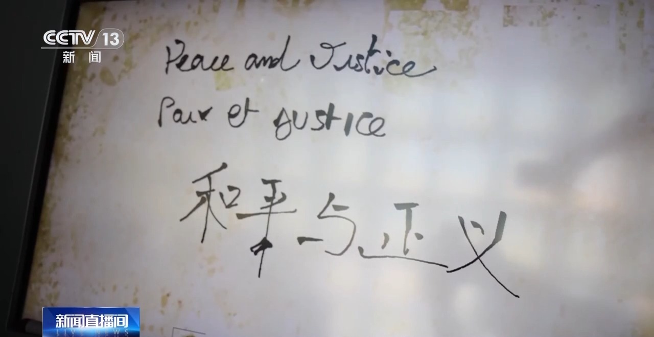 參觀完畢後,馬庫斯和士傑、鍾灝松在留言板上用中、英、法三國語言寫下了“和平與正義”的留言。