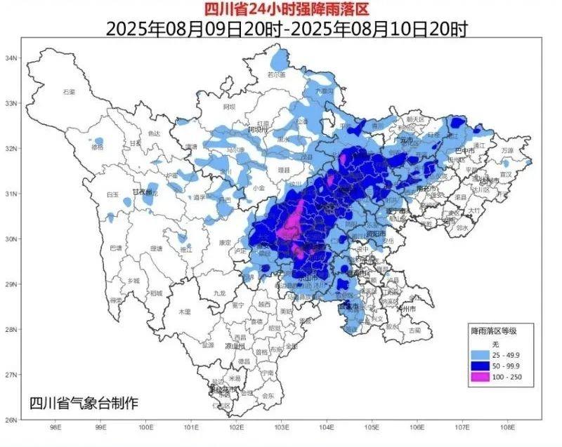 四川省氣象台8月9日15時45分發布暴雨藍色預警,8月9日20時到10日20時:綿陽、德陽、成都、雅安、眉山、樂山6市的部分地方有暴雨(雨量50~90毫米),局部大暴雨(雨量180~230毫米),最大小時雨強60~90毫米,並伴有短時雷雨大風。