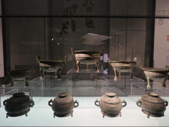“大家眼前這七尊造型相同、大小依次遞減的鼎,是迄今為止我國春秋早期出土青銅器中規制較為完整的一套諸侯級禮器,見證了西周時期的列鼎制度。”在七鼎六簋展品前,採訪團記者們被這套精美的青銅禮器深深吸引。梁帶村芮國遺址博物館講解員王錦娓娓道來:“西周時期,禮樂制度盛行,規定天子祭祀宴享用九鼎八簋,諸侯則用七鼎六簋。因此,我們可以推斷出該墓主的身份為諸侯級。而簋中的銘文‘內(芮)公作為旅簋’,更是為我們確定墓主的國別提供了確鑿的證據。”