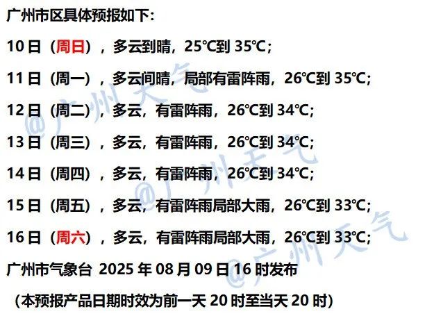 廣州市氣象台預計,8月10日—11日受副高環流控制,廣州高温炎熱持續,午後局部有雷雨。8月12日起廣州天氣又趨不穩定。