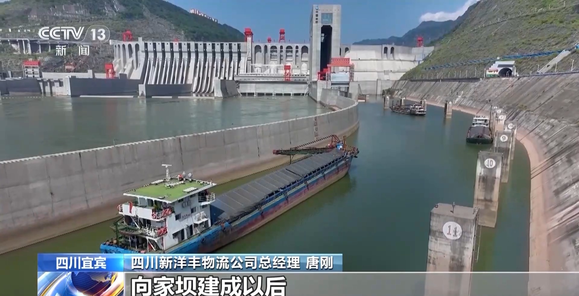 *四川新洋豐物流公司總經理 唐剛:*向家壩建成以後,大船能直接到廠門口裝貨,以前船舶一個月只能跑兩三趟,升船機運行後每月能跑五六趟,為企業發展帶來了極大改善。