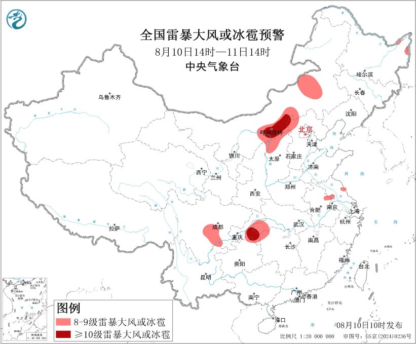 預計8月10日14時至11日14時,內蒙古中東部、華北北部、西南地區東部等地的部分地區將有8級以上雷暴大風或冰雹天氣,其中,內蒙古中部、重慶東南部、湖北西部等地的部分地區將有10級以上雷暴大風,最大風力可達11級以上;內蒙古中東部、東北地區東北部、江淮、江南北部、江漢、西南地區東部等地的部分地區將有小時雨量大於20毫米的短時強降水天氣,其中,內蒙古中部、安徽中部、江蘇中部、湖北東南部和西部、湖南北部、四川中東部、重慶西北部、雲南東北部等地的部分地區小時雨量大於50毫米,最大可達80毫米以上。