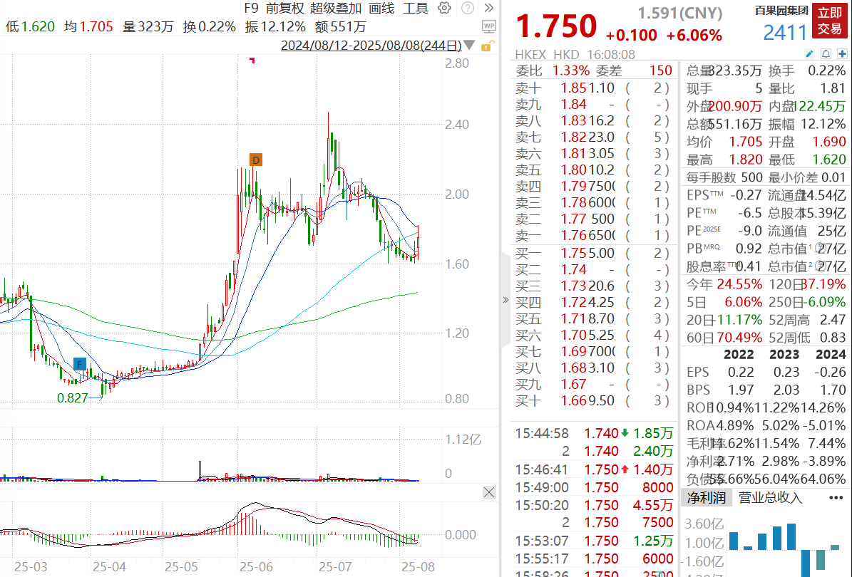 值得注意的是,2025年暑期熱播劇《長安的荔枝》引發廣泛關注,劇播期間恰逢新鮮荔枝上市,“百果園荔枝”相關話題量過億,僅荔枝品類銷售金額已超7700萬元。這一營銷成功直接推動公司股價在7月7日一度漲超20%,當天收漲13.73%。然而,這一短期利好並未能持續提振市場信心。此後,百果園集團股價震盪下行,截至8月8日收盤,該股報1.75港元/股,總市值為26.94億港元,較前期高點明顯回落。