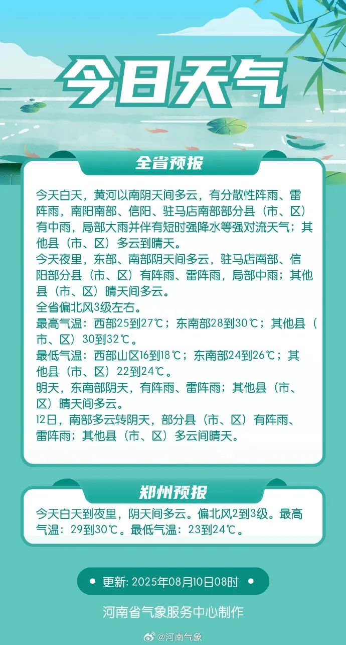 8月10日,記者從河南省氣象台瞭解到,今天白天,黃河以南陰天間多雲,有分散性陣雨、雷陣雨,南陽南部、信陽、駐馬店南部部分縣(市、區)有中雨,局部大雨並伴有短時強降水等強對流天氣;其他縣(市、區)多雲到晴天。今天夜裏,東部、南部陰天間多雲,駐馬店南部、信陽部分縣(市、區)有陣雨、雷陣雨,局部中雨;其他縣(市、區)晴天間多雲。全省偏北風3級左右。最高氣温:西部25到27℃;東南部28到30℃;其他縣(市、區)30到32℃。最低氣温:西部山區16到18℃;東南部24到26℃;其他縣(市、區)22到24℃。