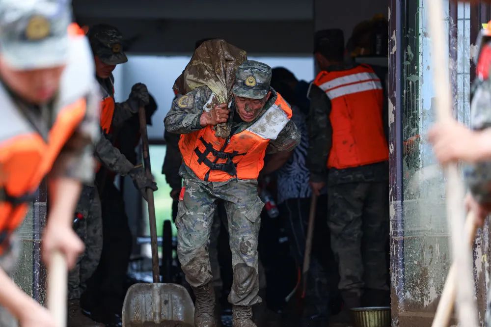 記者8日在救援現場看到,救援人員兩人一組用繩子將彼此連接,揹着鐵鍬蹚過泥水。他們背起受災羣眾,將其轉移至安全地帶,有的推車清理淤泥,為後續救援開闢道路。