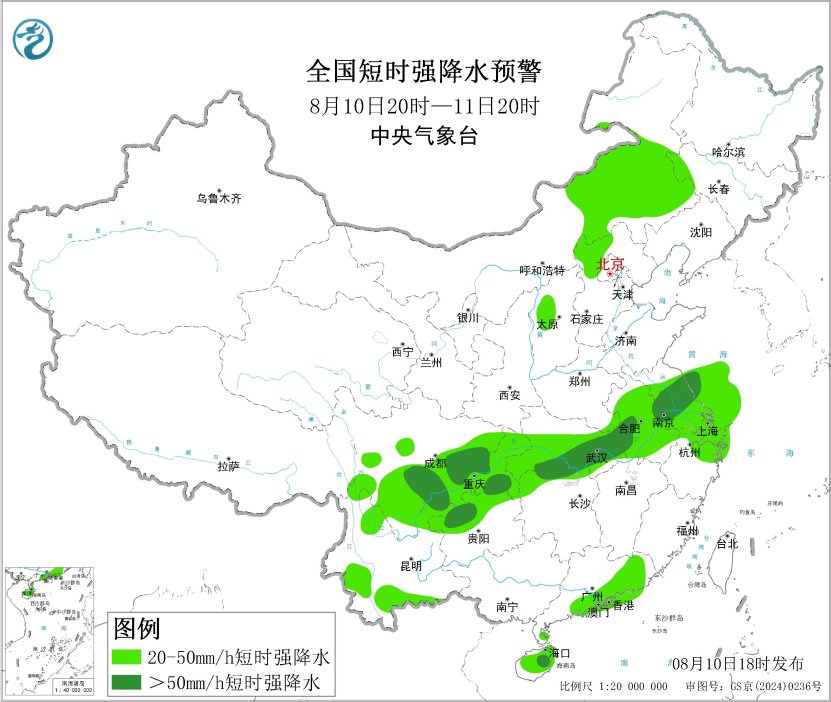 預計8月10日20時至11日20時,內蒙古東部、華北北部、西北地區中部、西南地區東部等地的部分地區將有8級以上雷暴大風或冰雹天氣,其中,內蒙古東部、河北西北部等地的部分地區將有10級以上雷暴大風,最大風力可達11級以上;內蒙古東部、江淮、江漢、江南北部、西南地區東部、華南南部等地的部分地區將有小時雨量大於20毫米的短時強降水天氣,其中,安徽中部、江蘇中部、湖北東部、湖南北部、四川東南部、重慶西部、雲南東北部、海南島東部等地的部分地區小時雨量大於50毫米,最大可達80毫米以上。